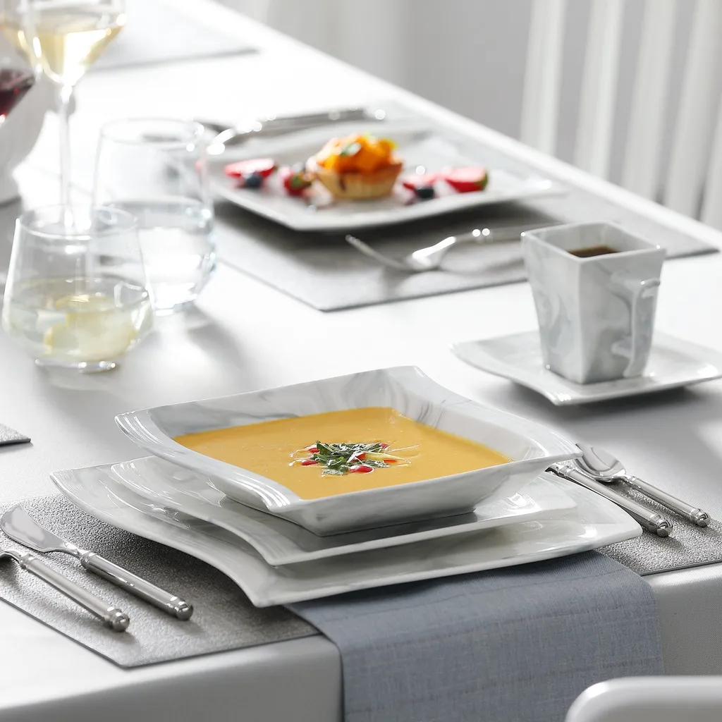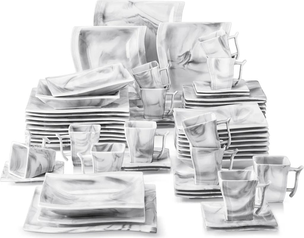 MALACASA, Serie Flora, 60 Tlg. Marmor Porzellan Geschirrset Kombiservice Tafelservice Mit Je 12 Kaffeetassen, 12 Untertassen, 12 Dessertteller, 12 Suppenteller Und 12 Flachteller
